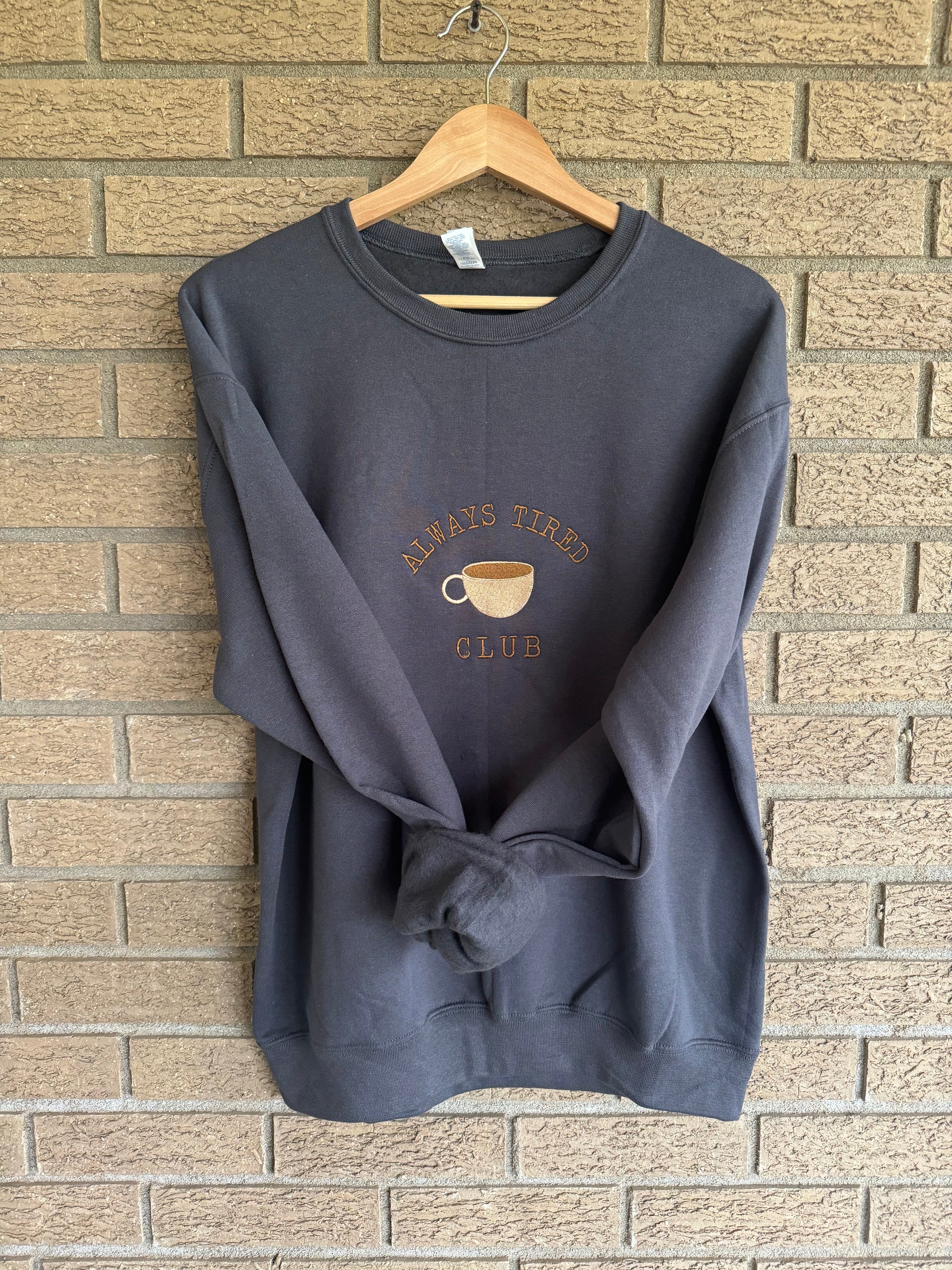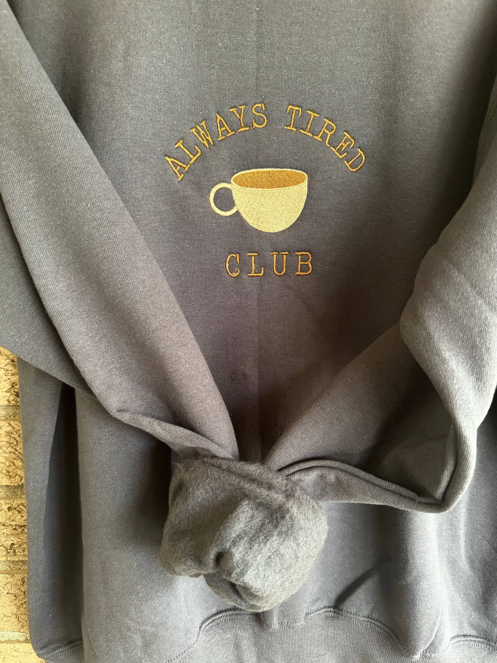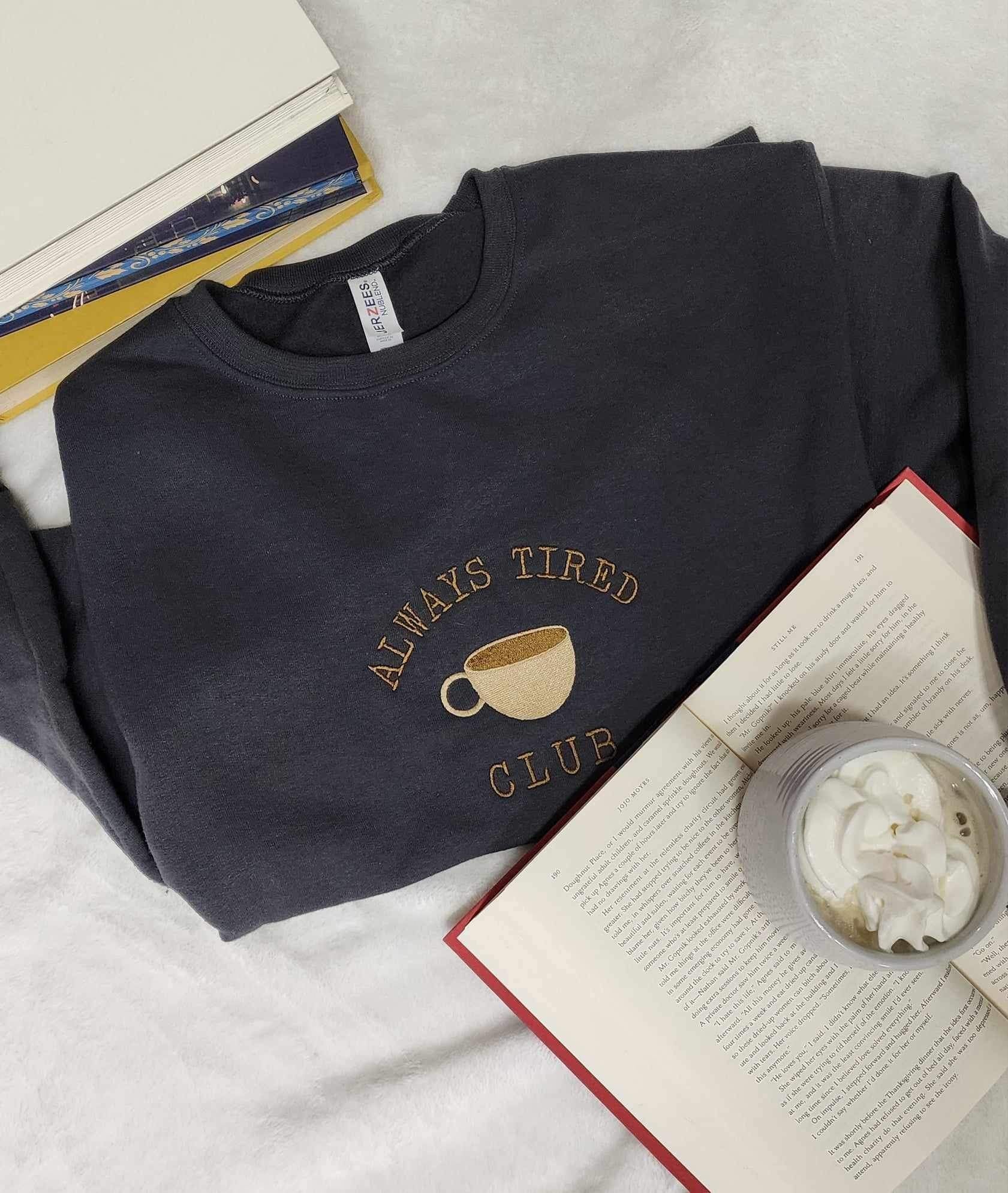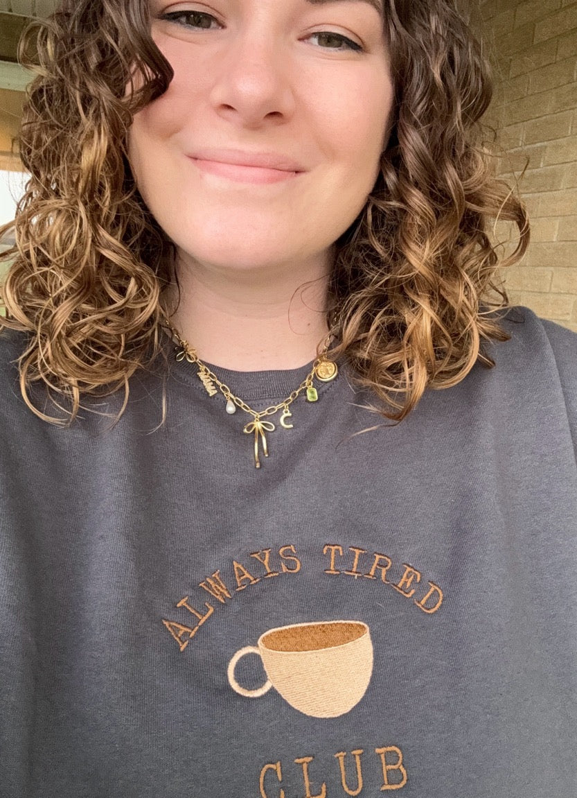 Join the Always Tired Club with our unique embroidered crew. This grey crew features an "always tired club" design that you won't find anywhere else. Made for ultimate comfort and style.