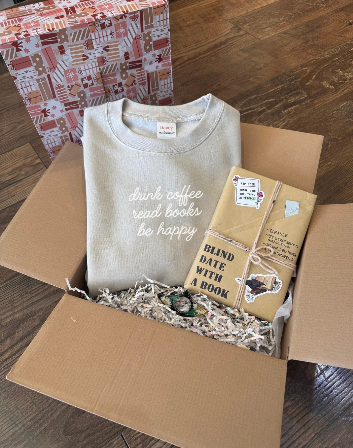 Looking for the perfect gift (even if it's for yourself)? Look no further than the Bookworm Box! This bundle box is a bookworm's dream come true, featuring a cozy Crewneck Sweatshirt from the Books & Coffee Beans Collection, a Blind Date with a Book, and a Book Page Holder.