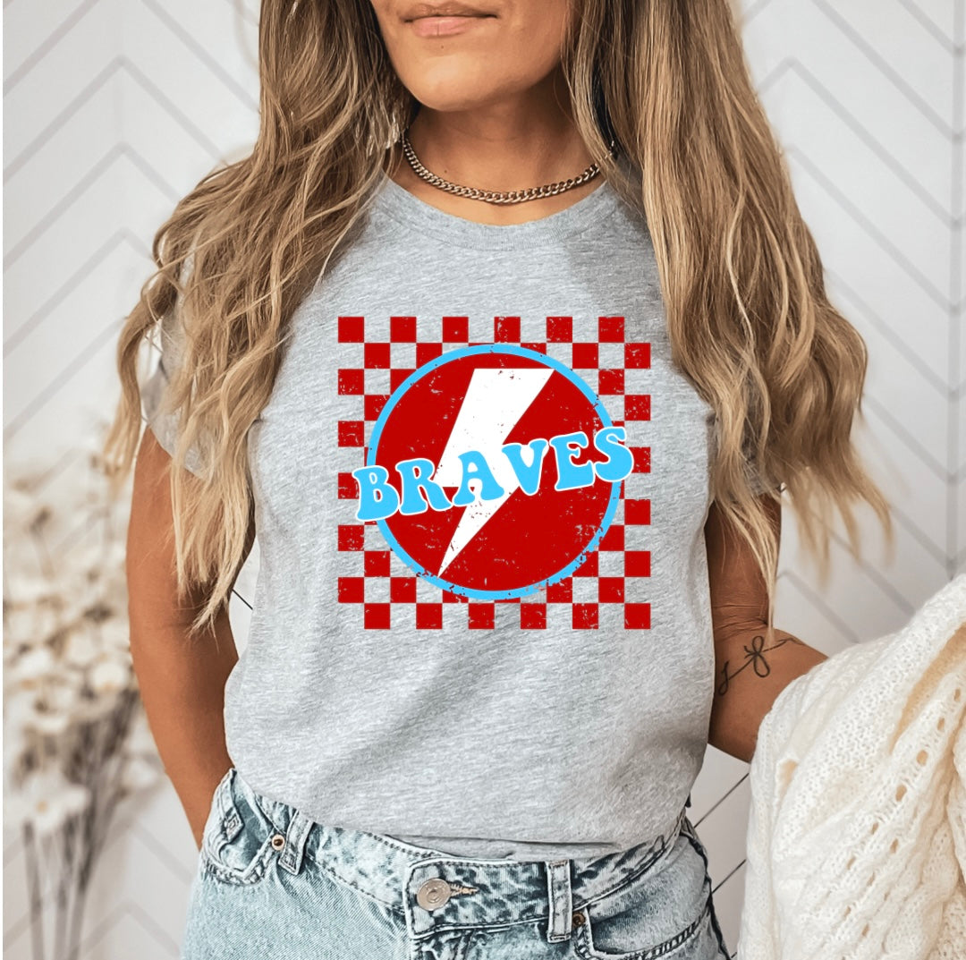 Checkered Braves Lightning bolt design on a grey tshirt or sweatshirt.