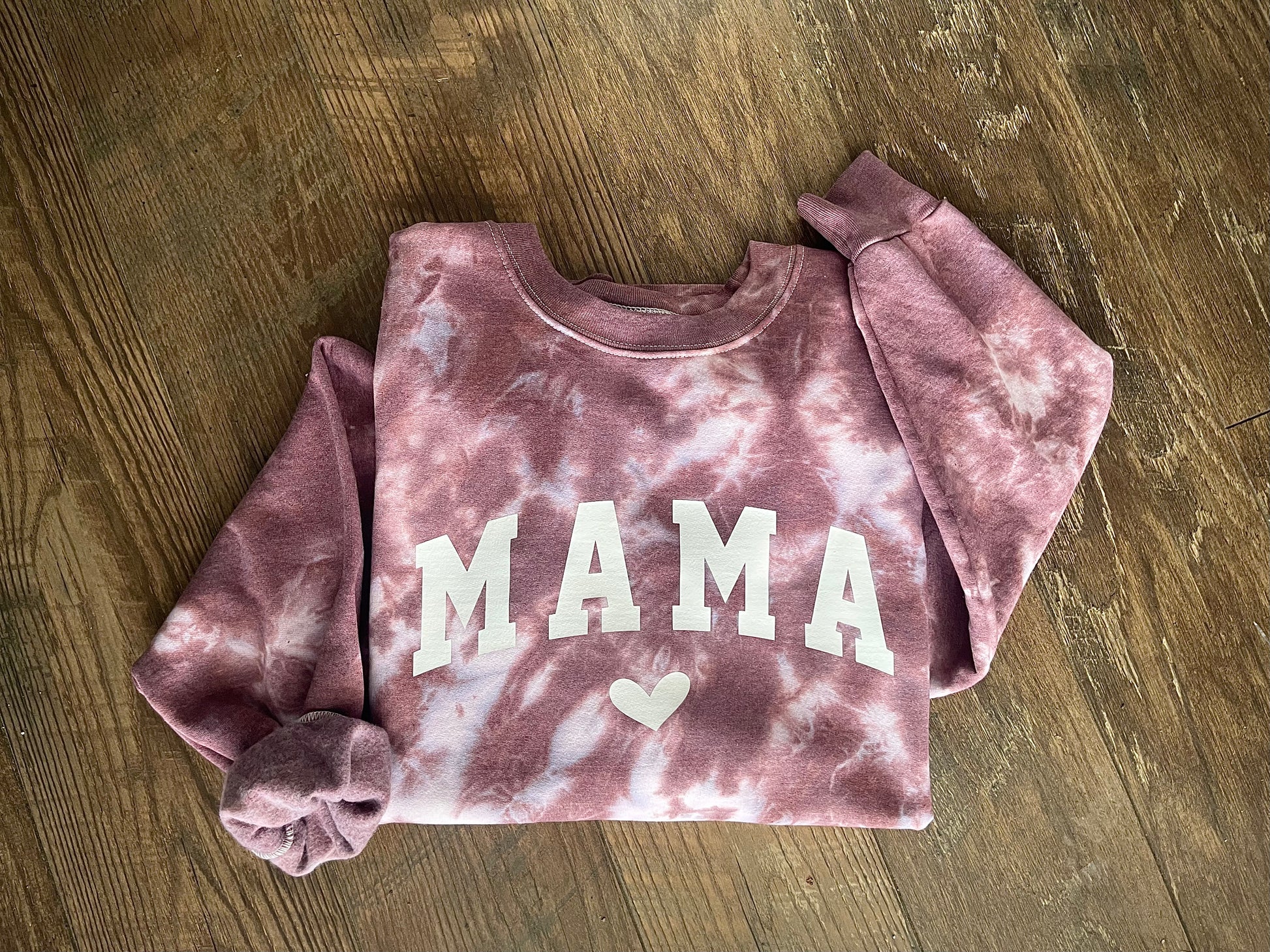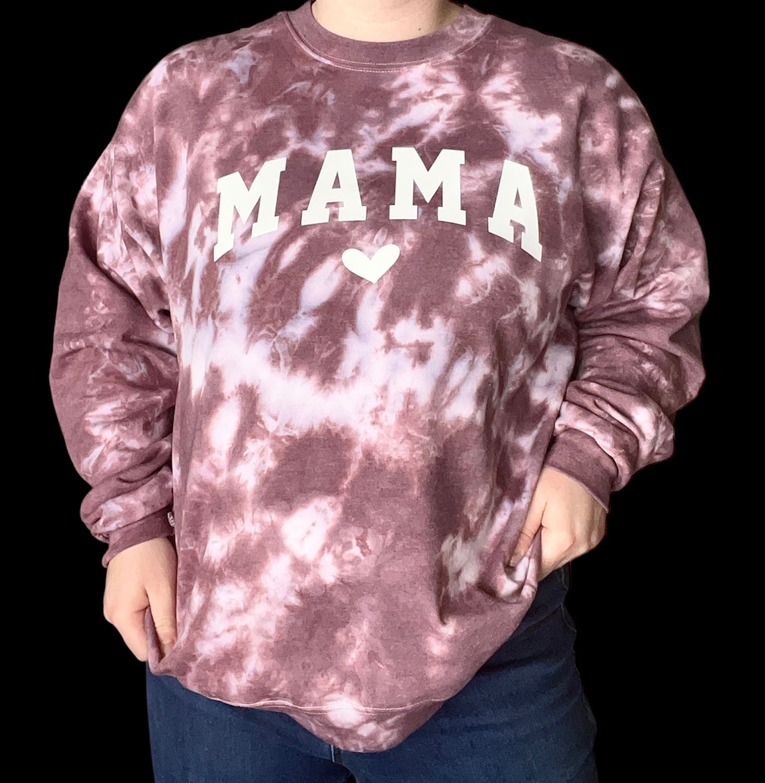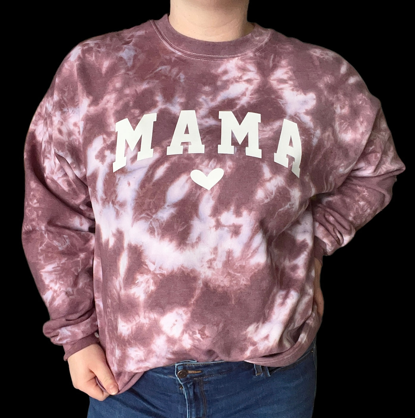 This sweatshirt is hand-dyed with high quality procion dye and finished off with a curved white mama design. This sweatshirt is the perfect addition to any mama’s closet.