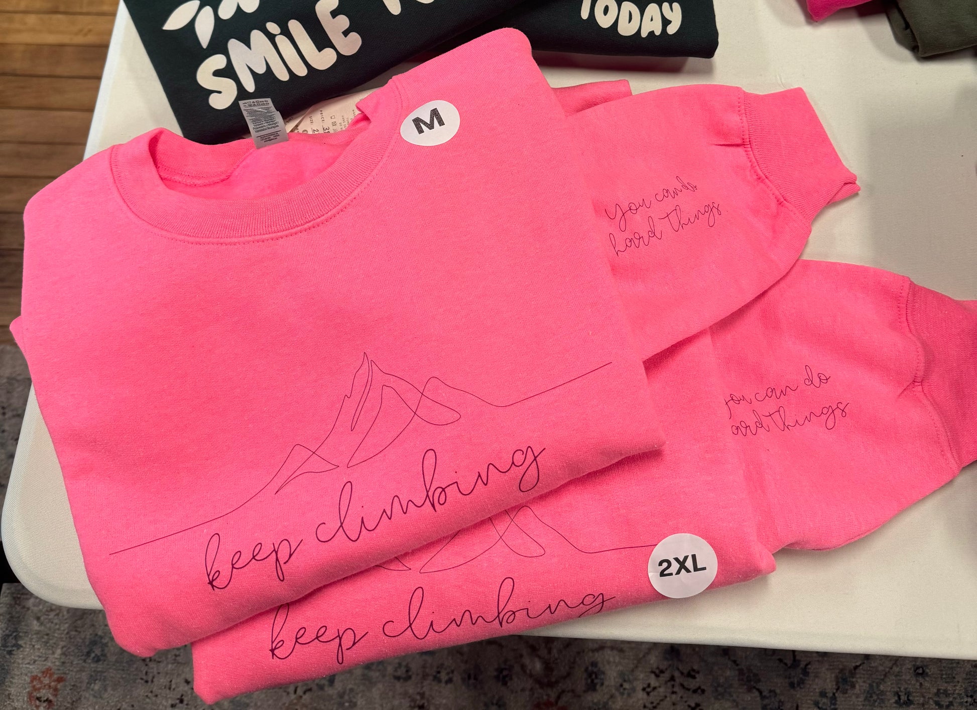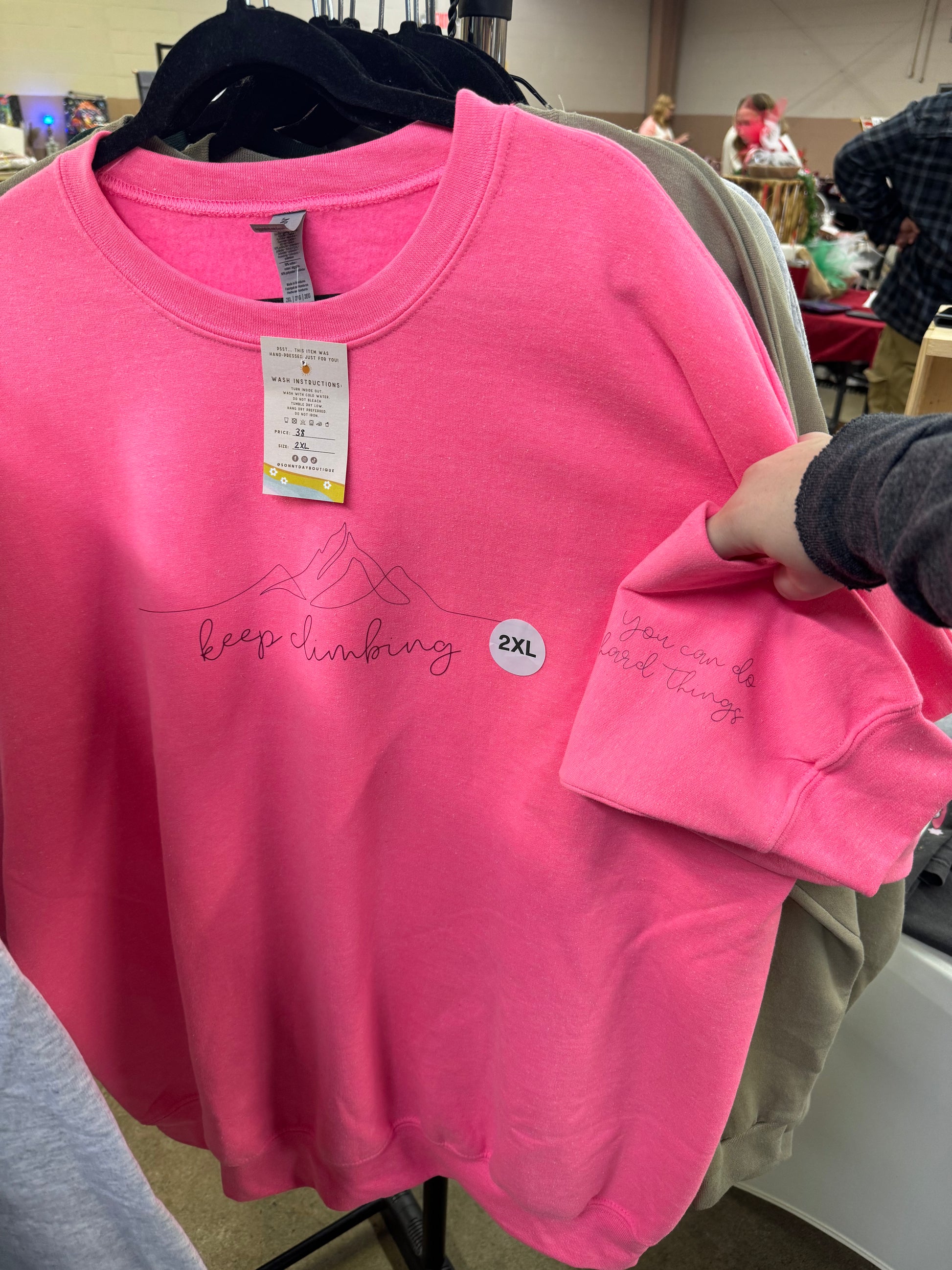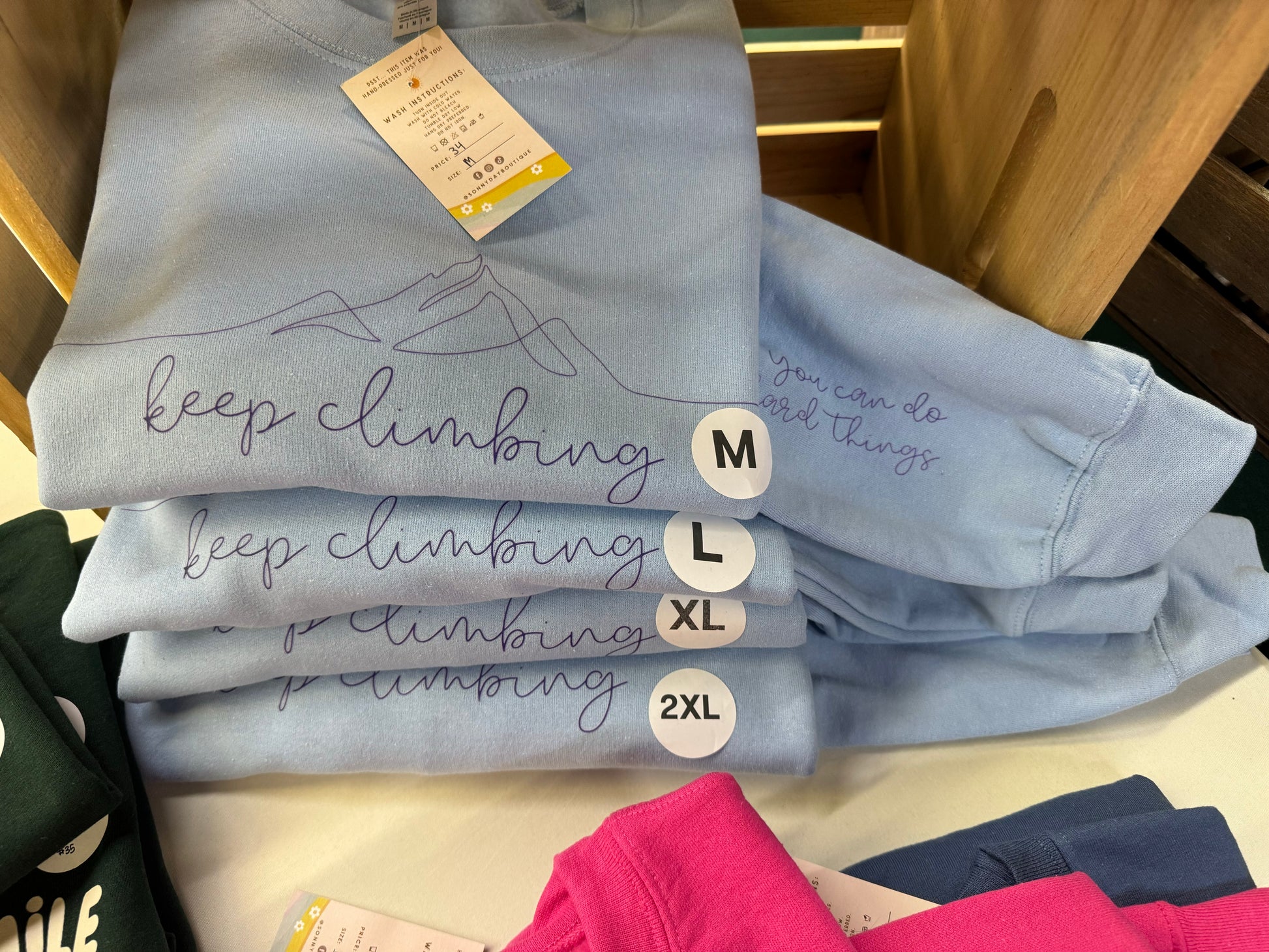 Climb higher and look good doing it with the Keep Climbing Crew! This simple yet stylish design includes an inspirational sleeve detail to give you the boost of motivation you need. With the motto: "You can do hard things," this crew will be your go-to for times when you need a reminder. Get yours now and let it remind you of the power you have!