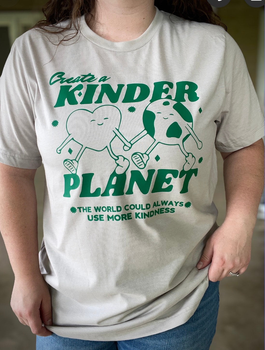 Create a kinder planet retro design on an off-white Bella Canvas tshirt.