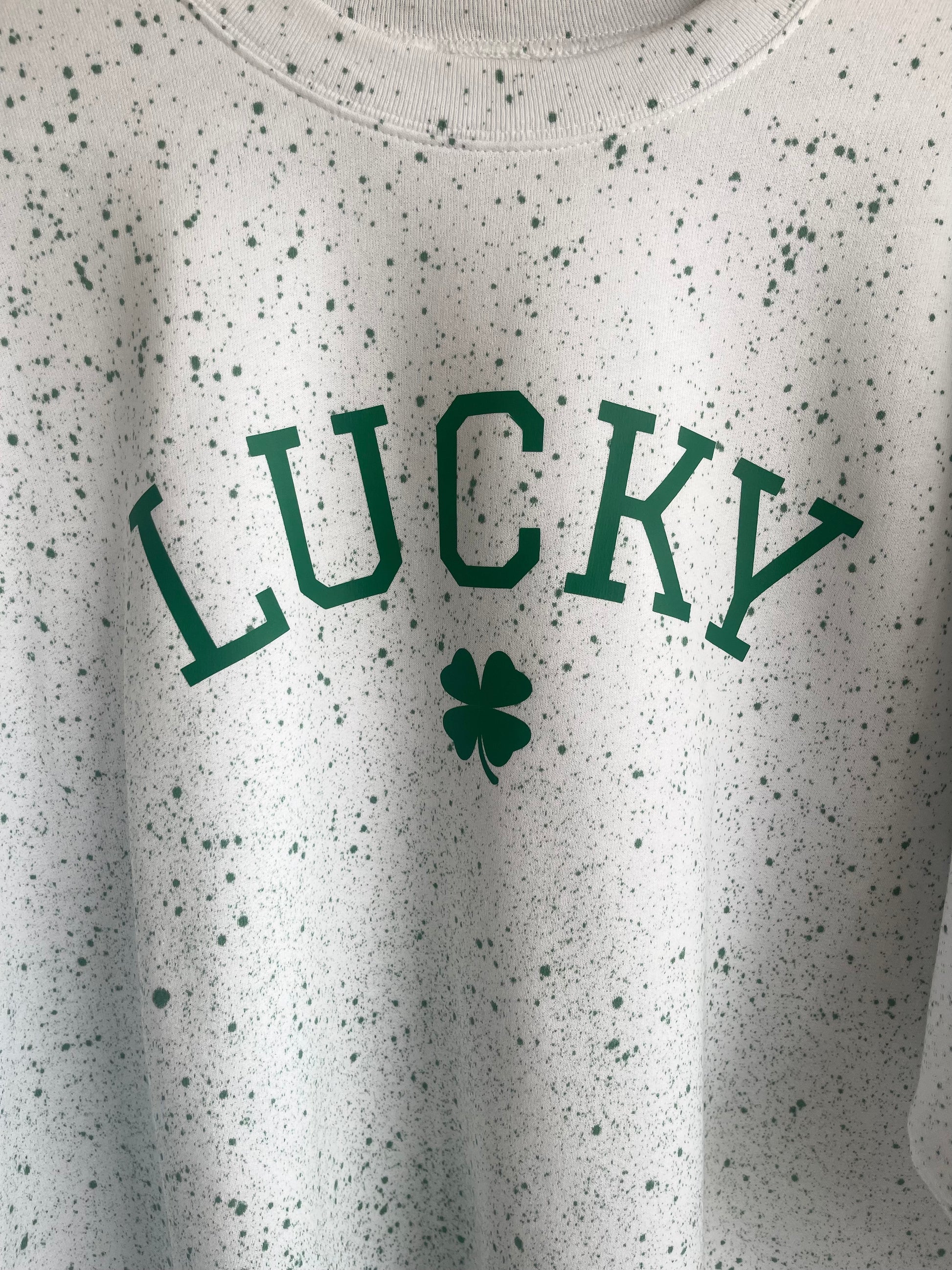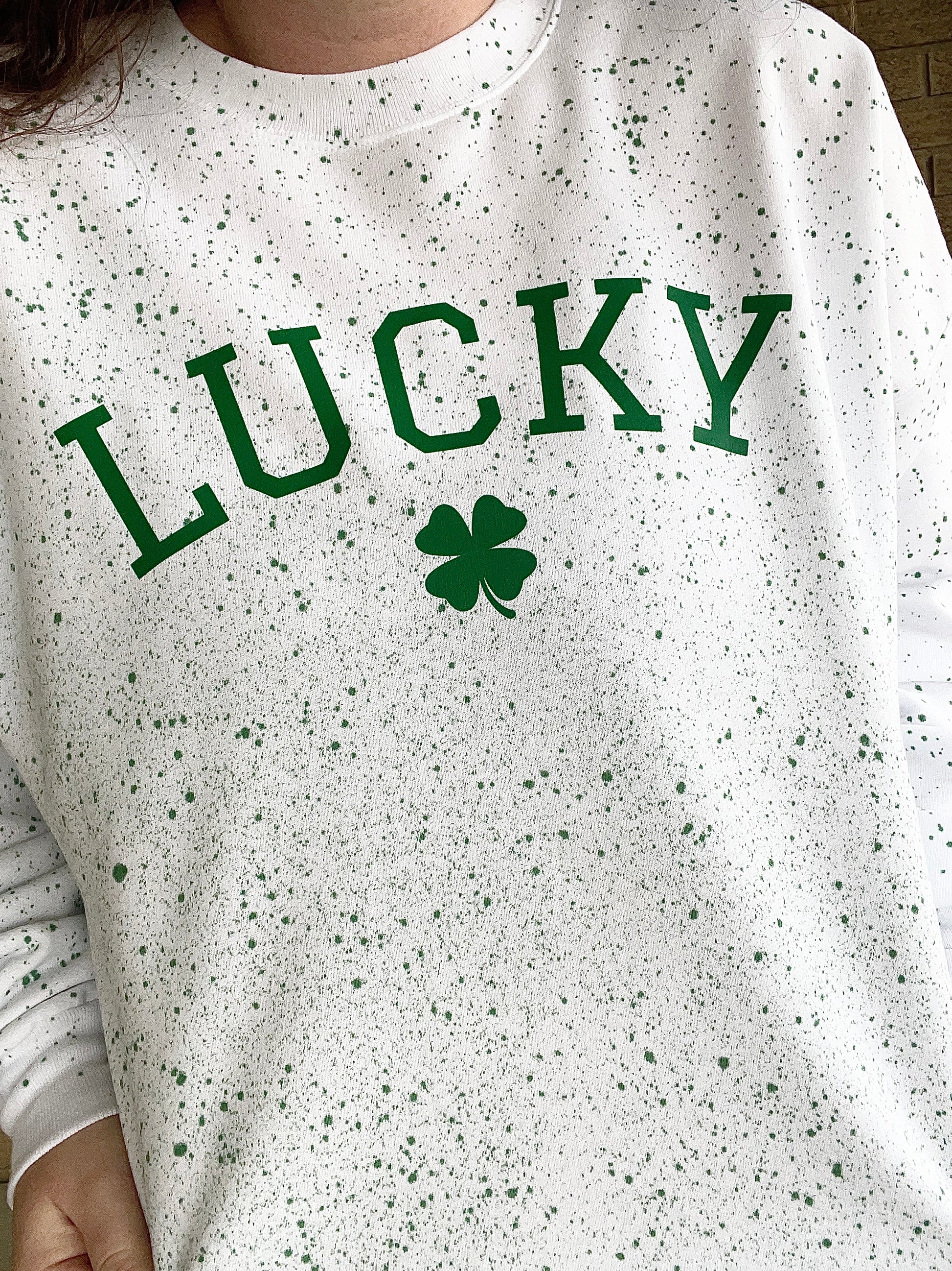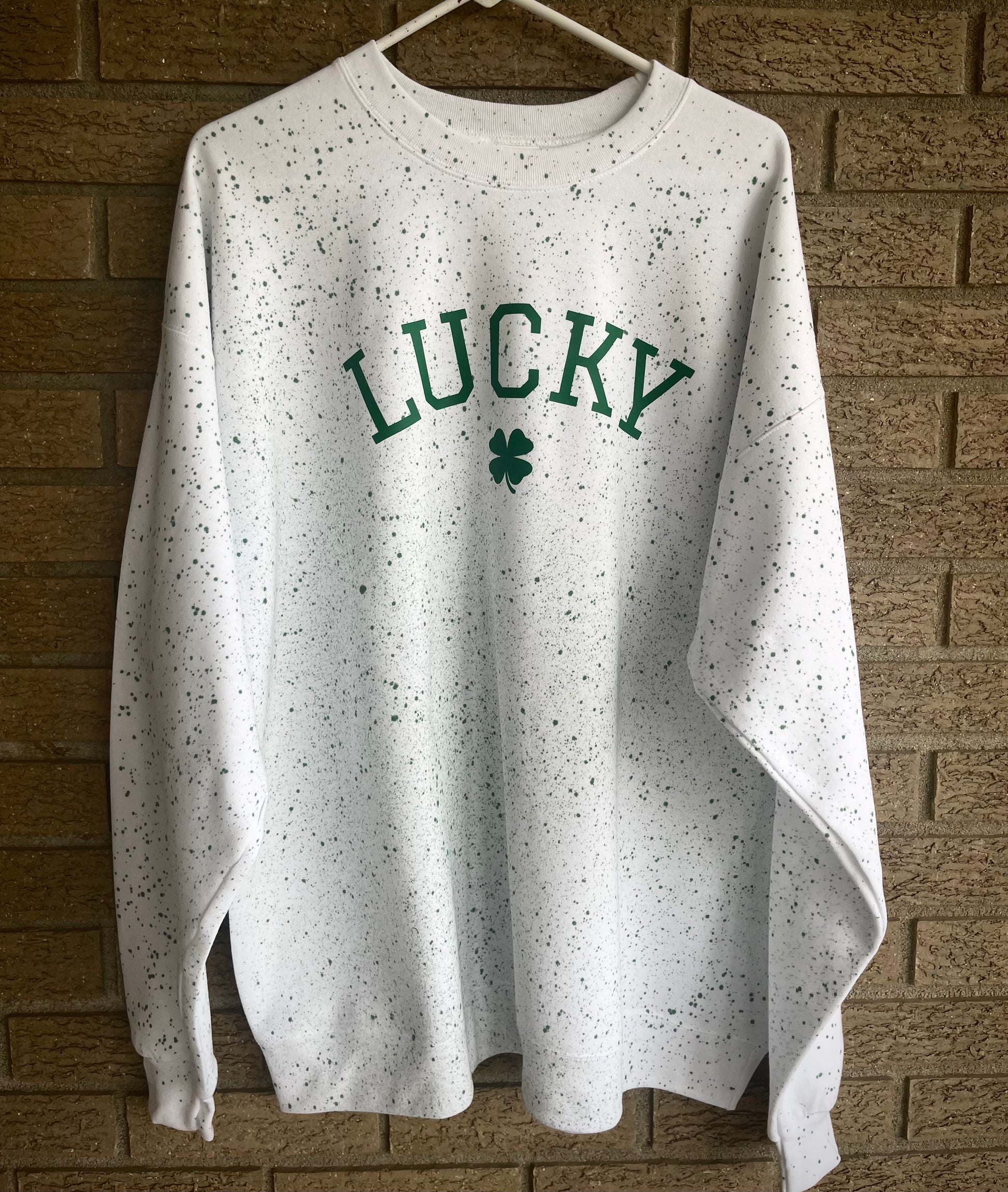 Snag this one-of-a-kind crew to have the perfect outfit for St. Patrick’s Day! This is a white Crewneck sweatshirt with a green splatter and curved “lucky” design in green.