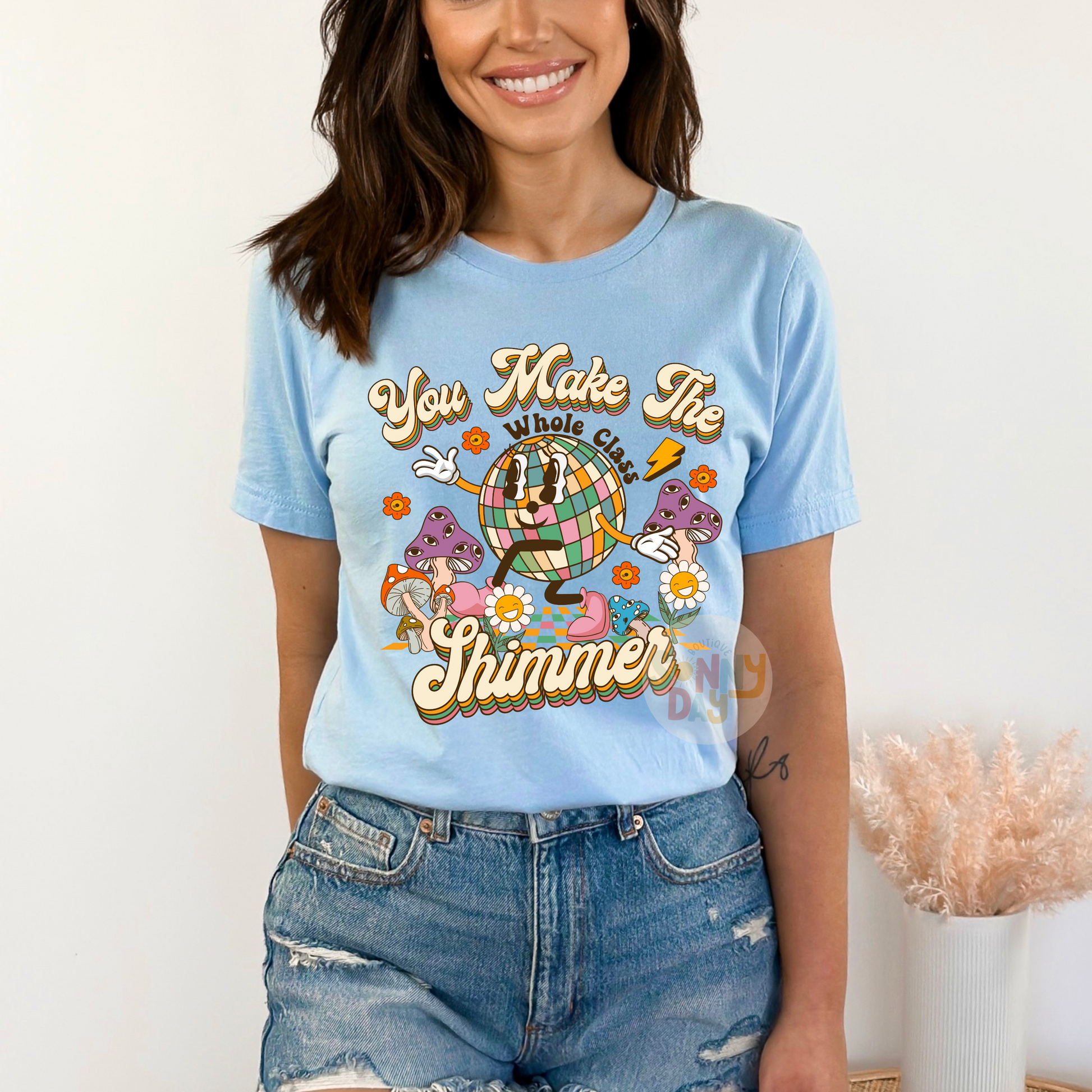 Elevate your teaching wardrobe with this light blue Shimmer Teacher Tee. Featuring a fun retro design that'll make the whole classroom shine, it's the perfect way to add a little quirk to your look. Let 'em know you're no dull teacher!