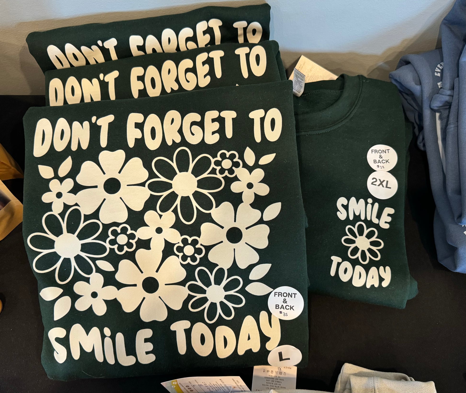 Treat yourself to style and smiles with this Smile Today Crew! Featuring an eye-catching retro floral design on both the front and back, it’s the perfect way to show your gold style and stay cozy.