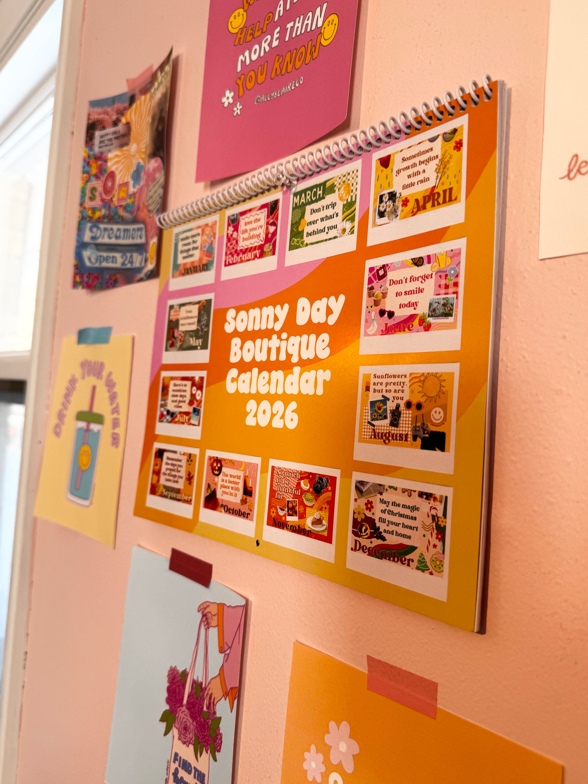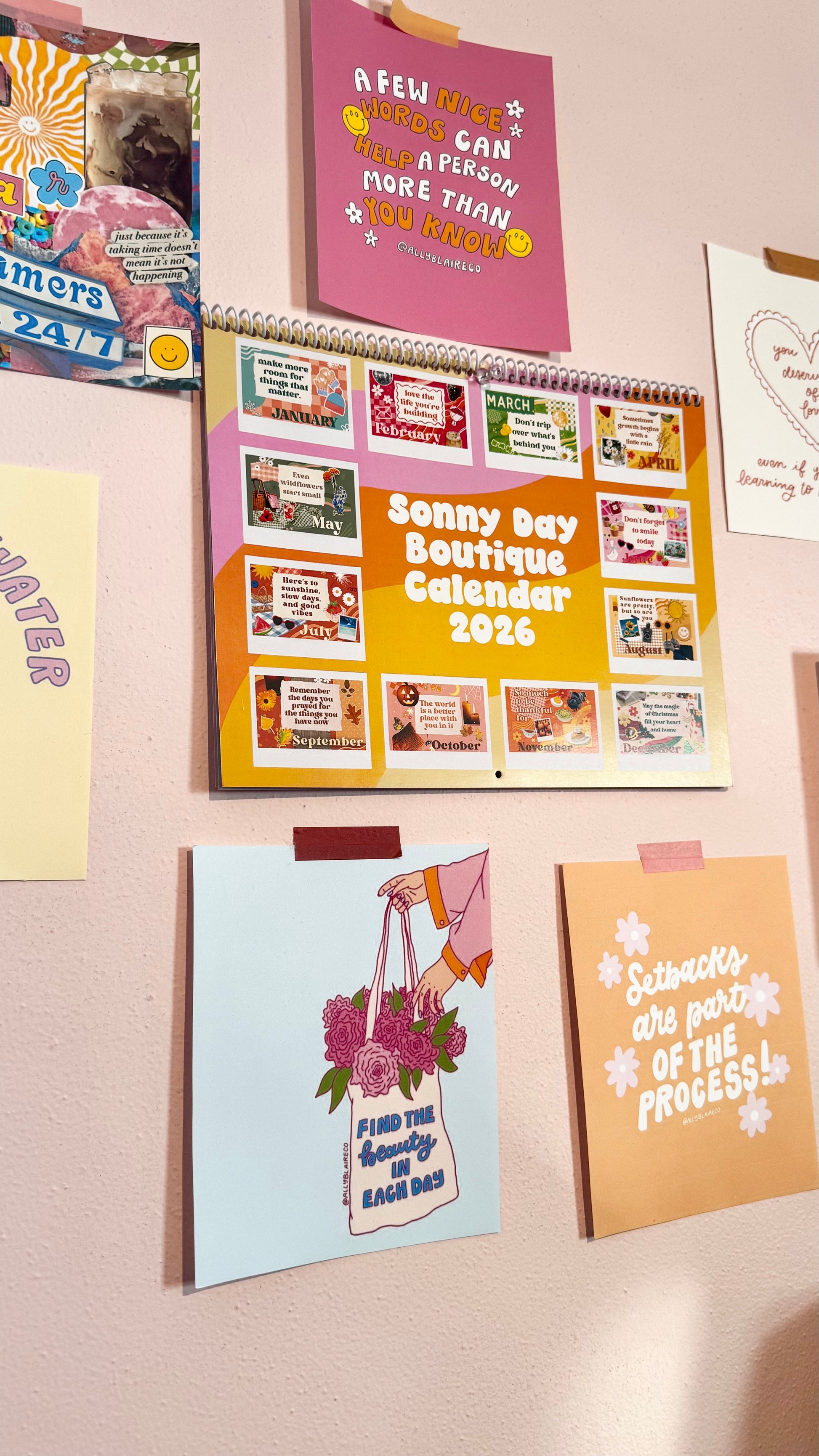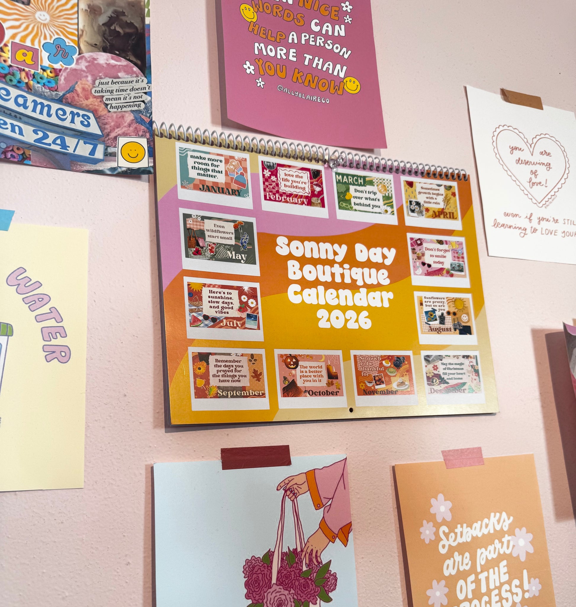 Introducing the 2026 Sonny Day Wall Calendar! Brighten up your days with inspiring monthly quotes and space to add your own goals and gratitude. Sized at 8.5x11”, this is the perfect addition to any home or office. This year's calendar is very limited so snag them while you can!