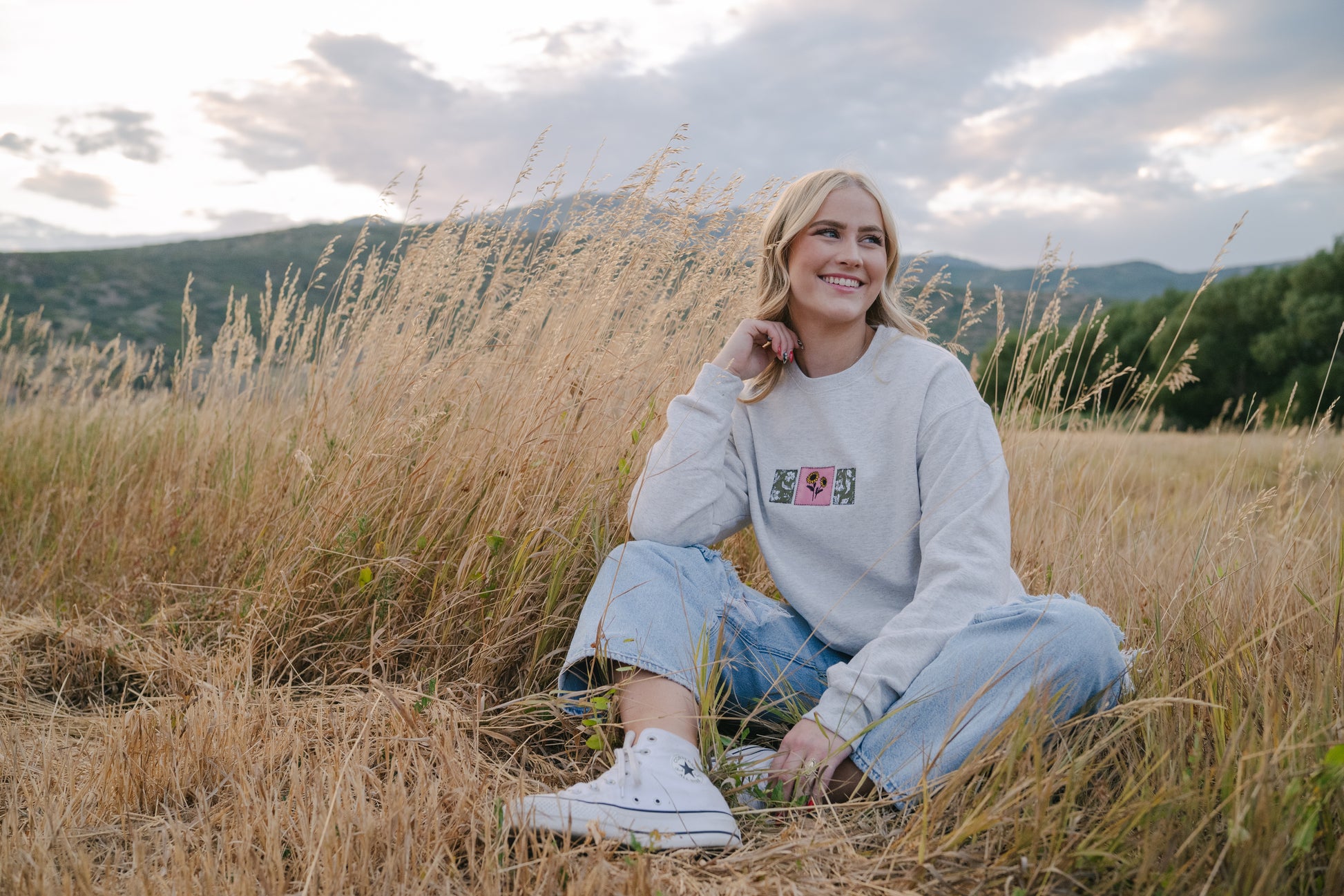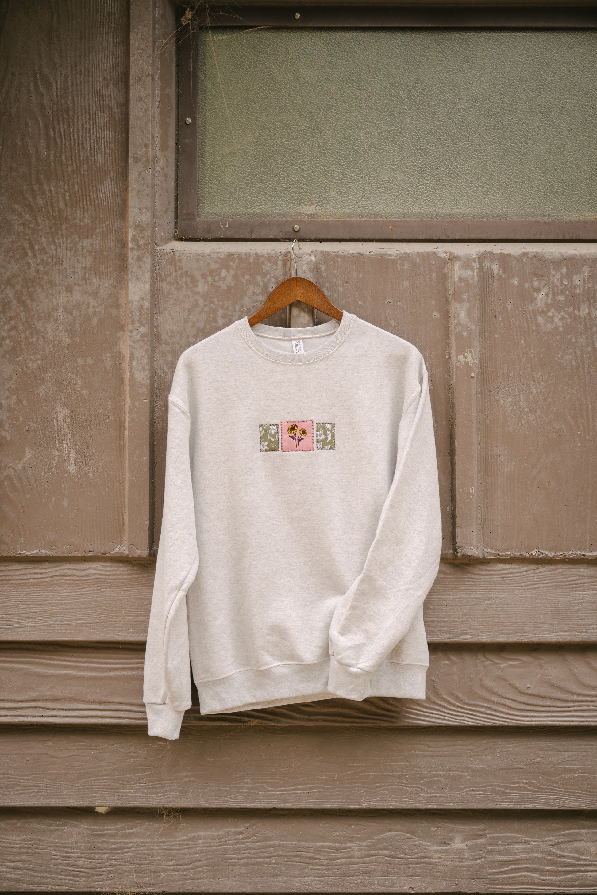 The Sunflower Fields Crew combines a cozy oatmeal heather crew with a unique applique and embroidered sunflower design, adding a simple touch to your crewneck collection.
