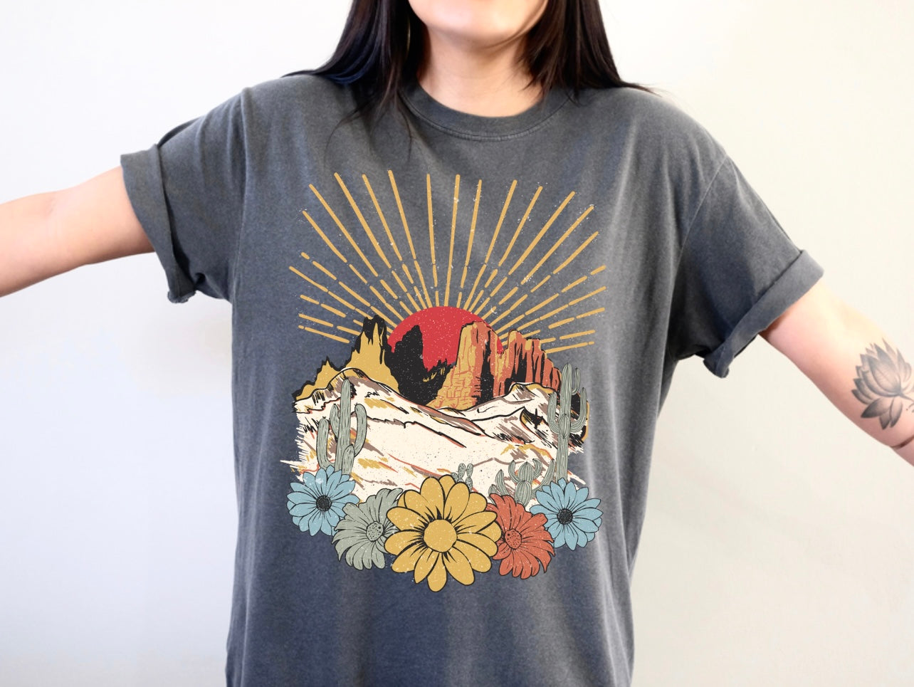 This new sunshine graphic tee is crafted with Comfort Colors fabric and is made with ultra soft and comfortable materials. It features a stunning desert-inspired design with an awesome sunshine graphic that's perfect for a chill summertime look.