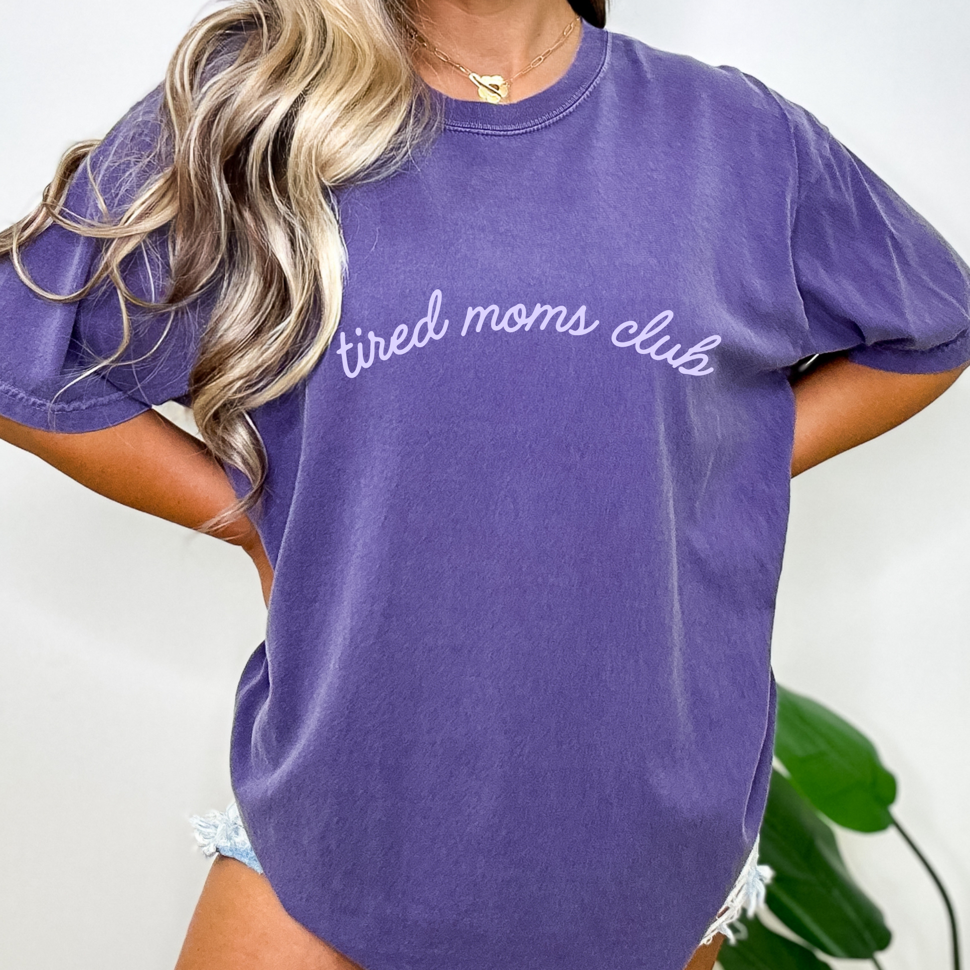 Show off your membership to the Tired Moms Club in style with this Comfort Colors tee featuring a cursive "tired moms club" design. This style is available in other colors as well. Message to request a special color combo!