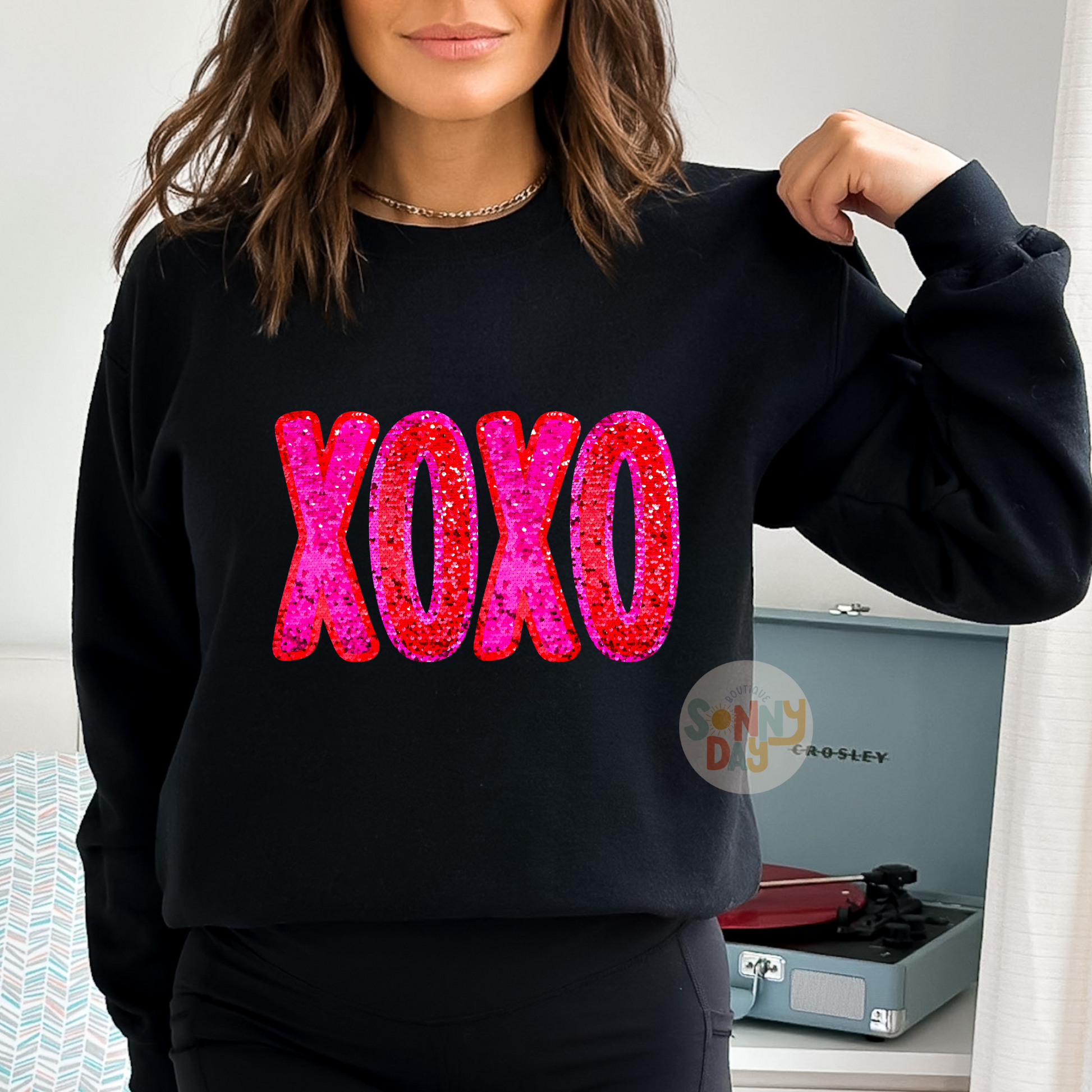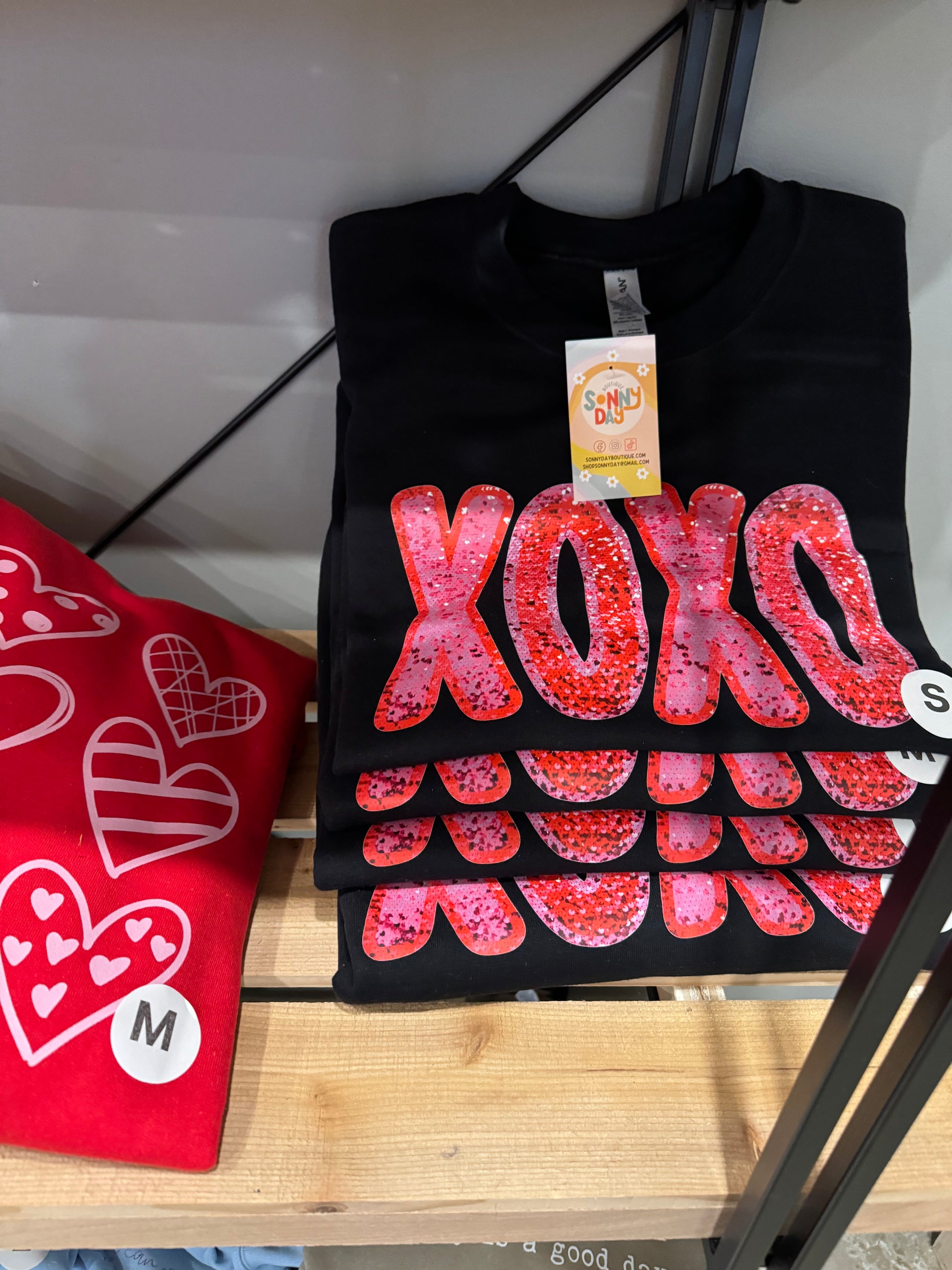Introducing XOXO Crew - the perfect addition to your wardrobe. With a faux sequin design that pops out well on the black crew, this shirt is sure to make a statement. Show off your playful side and spread love and kisses with the XOXO Crew. You'll be the talk of the town!